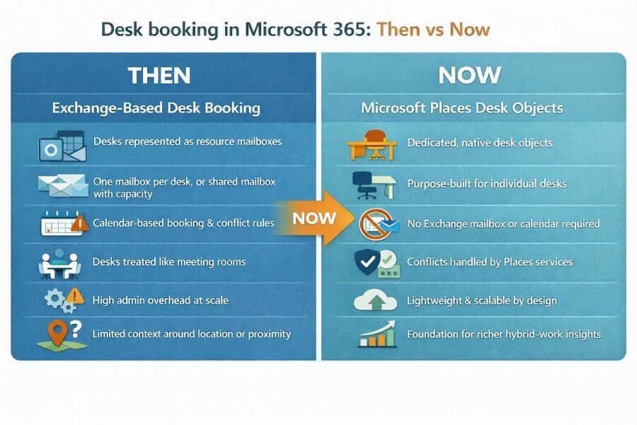 As of 2025, Microsoft Places now includes a native Desk object that represents individual desks more accurately than resource mailboxes and offers a modern, ‘lighter-weight’ alternative for organisations planning hybrid working solutions.