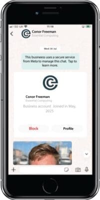 - Message templates and disclaimers. In addition to the disclaimer that the WABA set up requires, you can add other notifications for example, that all messages will be archived, if that is what you plan to do. Also you can have session templates such as ‘You’re chatting with Conor from the Essential sales team’.